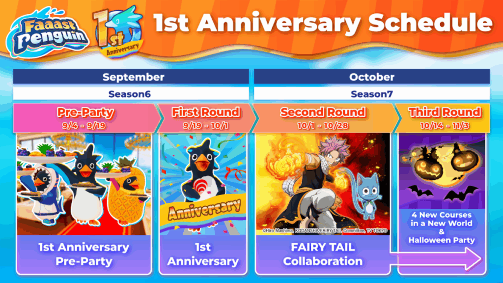 The action racing game Faaast Penguin will mark its first anniversary on September 19, 2025, kicking off with the pre-anniversary event, “1st Anniversary Pre-Party,” beginning tomorrow, September 4. Following the anniversary day, a three-part celebration campaign will roll out in sequence, featuring the 1st Anniversary Party, the FAIRY TAIL Collaboration, and the Halloween Party & New Course Releases. Join your favorite penguins on the racetrack and make the most of this special celebration!