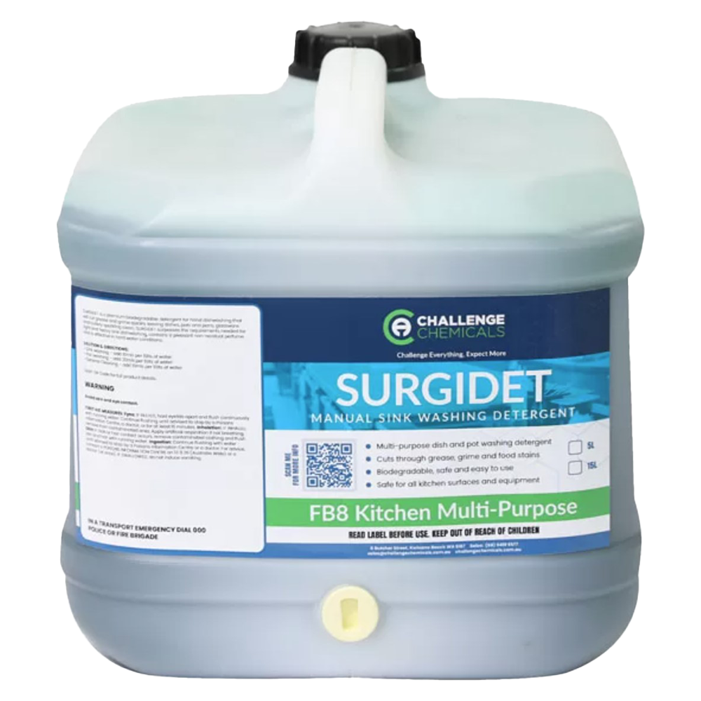 SURGIDET is a premium biodegradable detergent for hand dishwashing that will cut grease and grime quickly leaving dishes, pots and pans, glassware and cutlery sparkling clean. SURGIDET surpasses the requirements needed for light and heavy sink dishwashing, contains a pleasant non-residual perfume and is effective in hard water conditions.