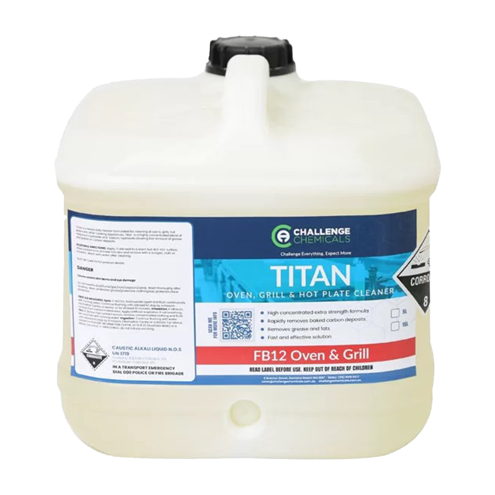 TITAN is a heavy duty cleaner formulated for cleaning of ovens, grills, hot plates and other cooking appliances. Titan is a highly concentrated blend of Potassium Hydroxide and Sodium Hydroxide allowing fast removal of grease and baked on carbon deposits.